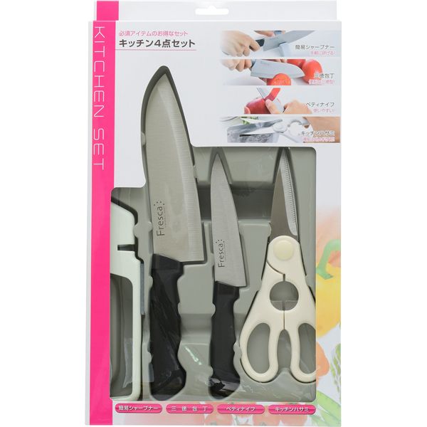 ●付属品・セット内容:ステンレス三徳包丁×1・ペティナイフ×1・キッチンハサミ×1・簡易シャープナー×1
