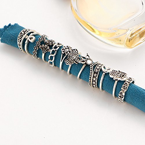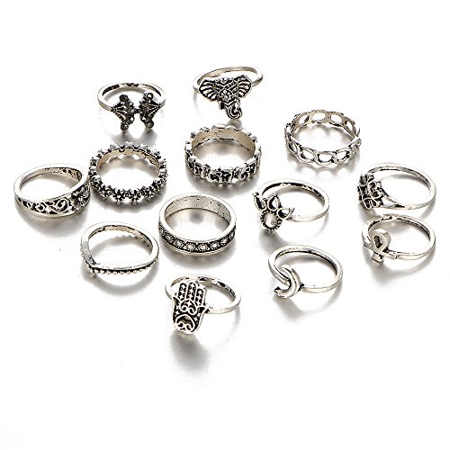 Setita 13 Pieces Turkish Elephant Moon Turquoise Joint Knuckle Nail Midi Ring Set Boho Ring Set (Ancient silver)