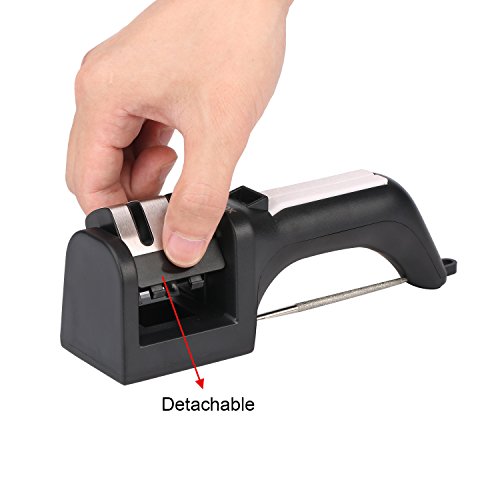 - Ergonomic and durable-The non slip cushion at its bottom offers a more stable base while its ergonomic handle provides a comfortable,easy grip. Its shell is made of durable ABS material,and its 2-stage sharpening slot can be disassembled and replaced.It' s the perfect complement in most kitchens