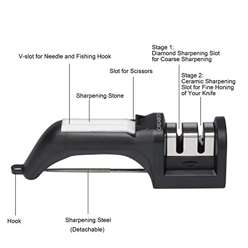 CREABOX Knife Sharpener for Straight,Serrated Knives and Scissors-2 Stage Diamond Sharpening System-Multifunction Sharpener-Manual-Black