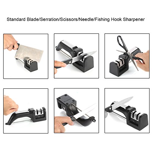 - It is safe to use and work for many types of blades-Coarse slot and fine slot works for standard blades,including high-quality,hard steel blades.Sharpening steel works for serrated blades.Scissors slot works for Scissors.V-slot works for needles,fishing hooks,screwdrivers and awls.Corundum sharpening stone can be deal with deformed knife