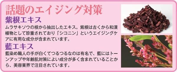 エイジングケアで話題の「藍エキス」「紫根エキス」がたっぷり入った専用パックで気になるラインにピーンと貼り付け集中ケア。パックをはがすとしっとりみずみずしいお肌に。 |