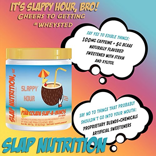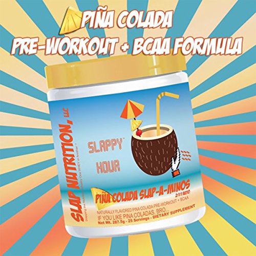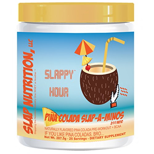 -. Binding : Health and Beauty -. Brand : SLAP Nutrition -. EAN : 0649684132852 -. Feature : SLAP-A-MINOS: We combined a powerful pre-workout formula & BCAA's into one delicious drink. / PINA COLADA: If you like pina coladas... then this is for you! It tastes great, and has even greater results! We use Stevia for a healthy, sweet taste. / PRE-WORKOUT: Take a scoop and go Beast-Mode on your hardest workouts! / BCAA: We got your back! We added a specific BCAA blend that will have your body in instant recovery mode. / SLAP NUTRITION: We love this 2 in 1 product and we know you will too. SLAP Nutrition was created by folks who wanted to stop getting slapped by the nutrition industry, and start slapping back! -. IsAdultProduct : 0 -. Label : SLAP Nutrition -. Manufacturer : SLAP Nutrition -. ProductGroup : Health and Beauty -. ProductTypeName : HEALTH_PERSONAL_CARE -. Publisher : SLAP Nutrition -. Studio : SLAP Nutrition -. Title : SLAP Nutrition | Slappy Hour | A-Minos Pre-Workout + BCAAs | 25 Servings (Pina Colada) -. UPC : 649684132852