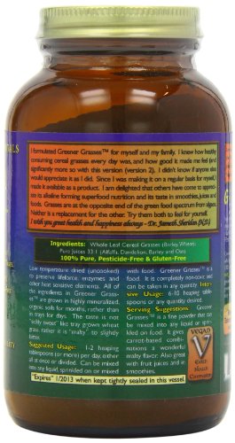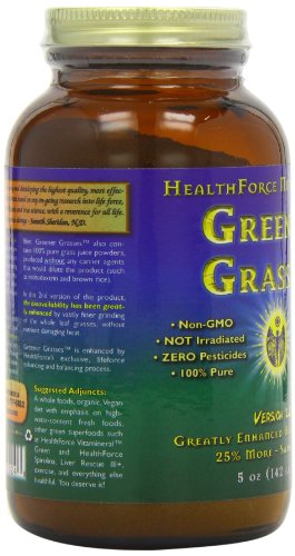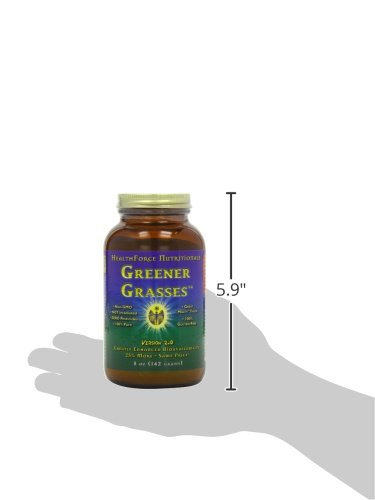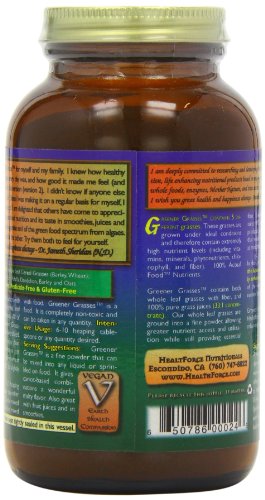 Studio : Healthforce Publisher : Healthforce Binding : Health and Beauty Product Description Greener Grasses - 5 oz Incredible Value, Nutrient Dense, 100% Pesticide free, Nutritional Grass Complex Greener Grasses™ is an incredible combination of green grasses. It provides healthy alkaline elements and a large amount of 100% whole food nutrients (vitamins, minerals, trace minerals including those that are naturally colloidal and better, chlorophyll, fiber, phytonutrients, and more) It contains 5 different forms of 100% pesticide free grown grasses: Whole leaf : Wheat Grass, Barley Grass Pure Juices : Alfalfa Leaf, Dandelion Leaf, Barley Grass, Oat Grass These grasses have incredible nutrient profiles due to the unique, nutrient-dense soil, multiple growing locations and harvesting just before the "jointing stage" of the grasses. Greener Grasses™ actually tastes good! It is not "too sweet" like fresh grass juice due to harvesting the mature, rather than immature, grasses. It actually has a pleasant "Malty" flavor that really adds nice flavor to carrot-based juices and even citrus juices. We even have a recipe for "Malted Vegetable Juice" in the book "Uncooking With Jameth Kim". Due to micro-fine grinding techniques used with the whole leaf grasses, Greener Grasses™ has a smooth, non-gritty texture, yet still provides needed fiber. Excellent Source of fiber and nutrients to support a healthy bowel, plus so much more! Bio-available and non-toxic vitamins, minerals, trace minerals, chlorophyll, phytochemicals, and more! Suggested Usage : 2 or more heaping tbsp. per day, mixed in any liquid , added to smoothies, salads, or any food/drink. 0