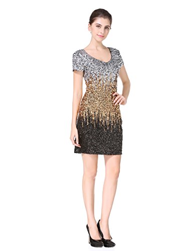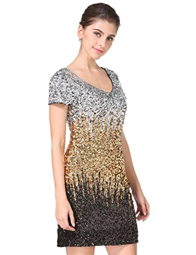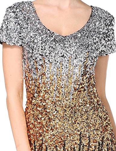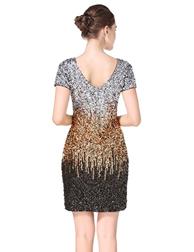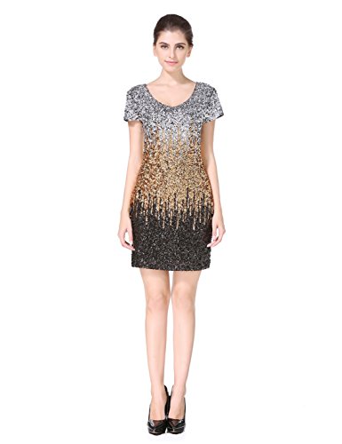 Women's Sequin Glitter Short Sleeve Gowns Sexy V Neck Mini Party Bodycon Dress Not Itching(S,Gold)