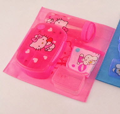 Teman perjalanan anda yang cute ini 1 set terdiri dari : handuk kecil, small storage, small cup, lunch box, hand bag, dan sendok kecil