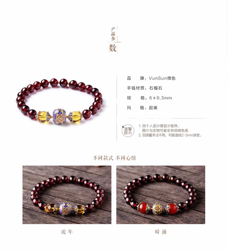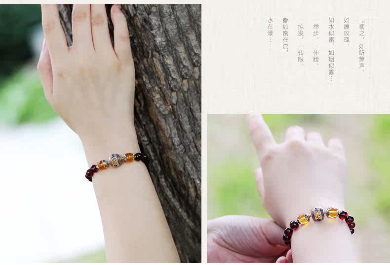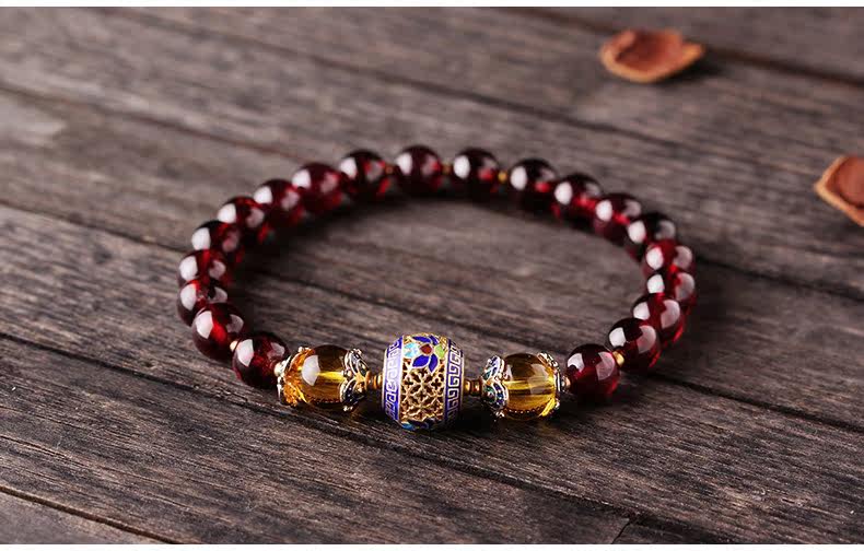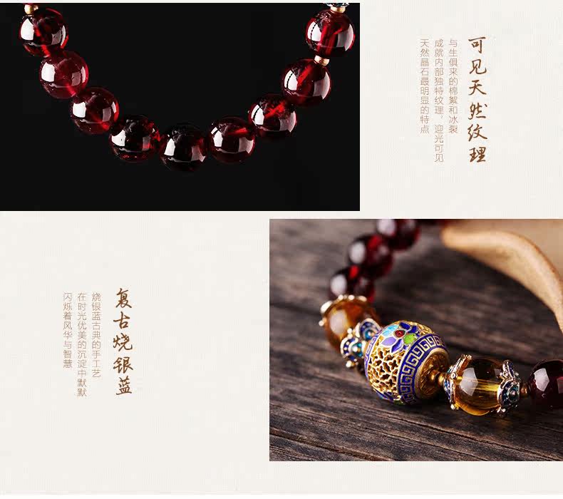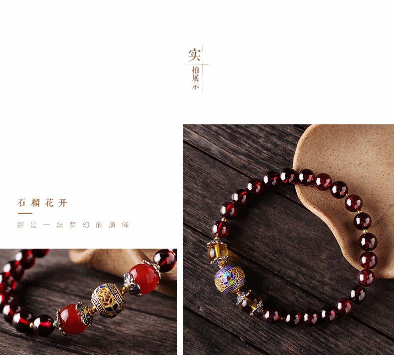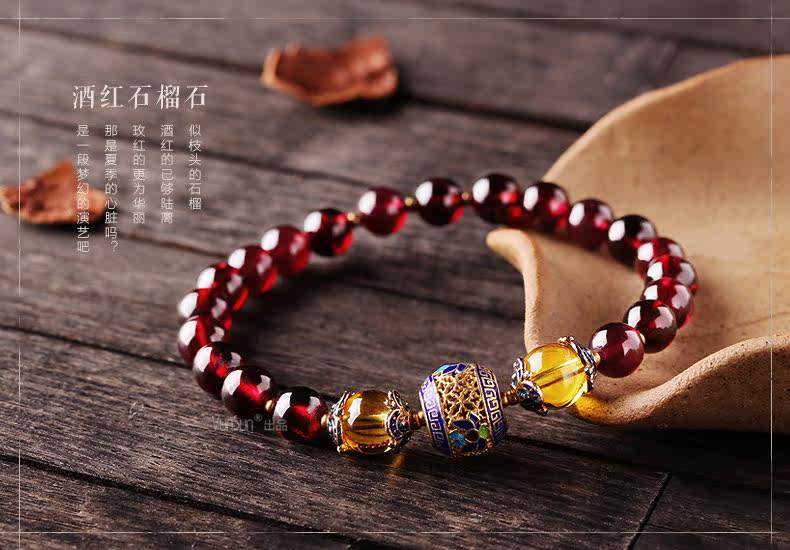 VunSun天然酒红石榴石手链女单圈手串景泰蓝民族风文艺母亲节礼物