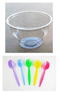 -. Feature : 48 ct Disposable Clear Ice Cream Cups (8 oz) / 50 ct Disposable Color Spoons (Purple, Blue, Green, Yellow and Pink)