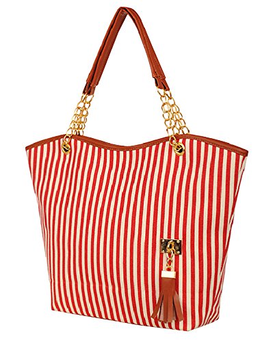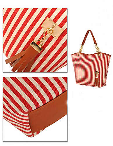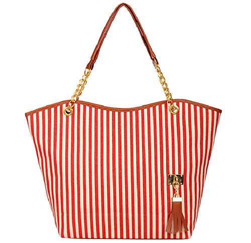 JOVANAS Fashion Stripe Design Women Street Snap Candid Tote Single Shoulder Canvas Bag Handbag (Red)