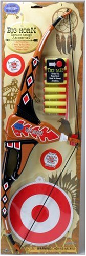 Big Horn Archery Set: Big Horn Archery Set: This Replica Big Horn Archery Set features an air-powered bow, sticky tip foam darts with rapid fire clip and a bullseye target. Fire 8 sticky tip foam darts without reloading for continuous fun! Sticky darts stick to almost anything. Big Horn Bow is styled with authentically Native American decorations and colors. Recommended Ages 6+.Feature