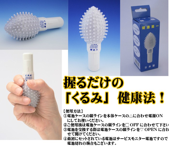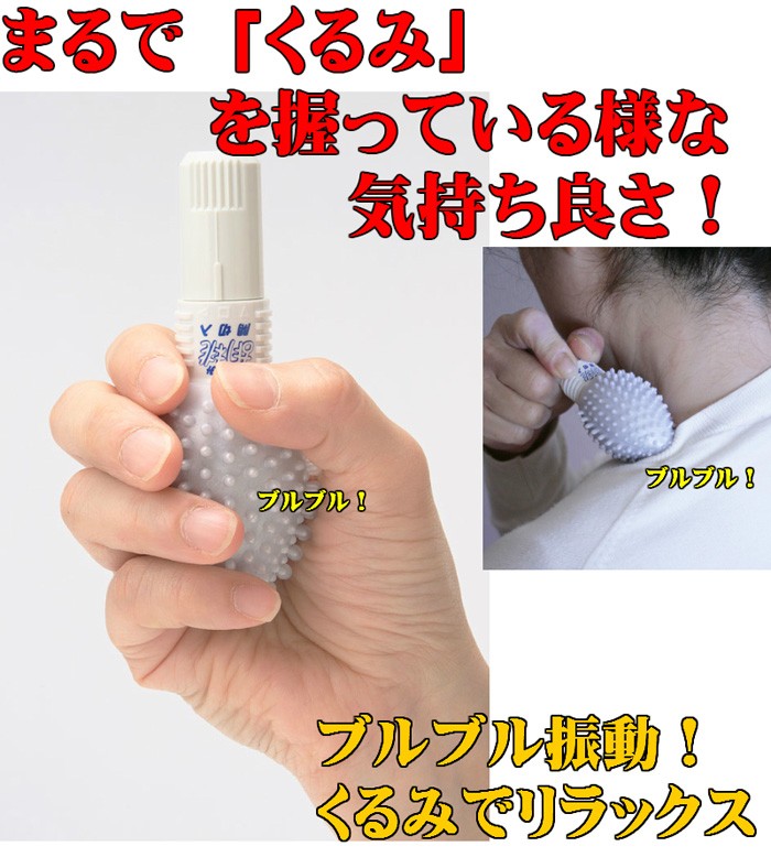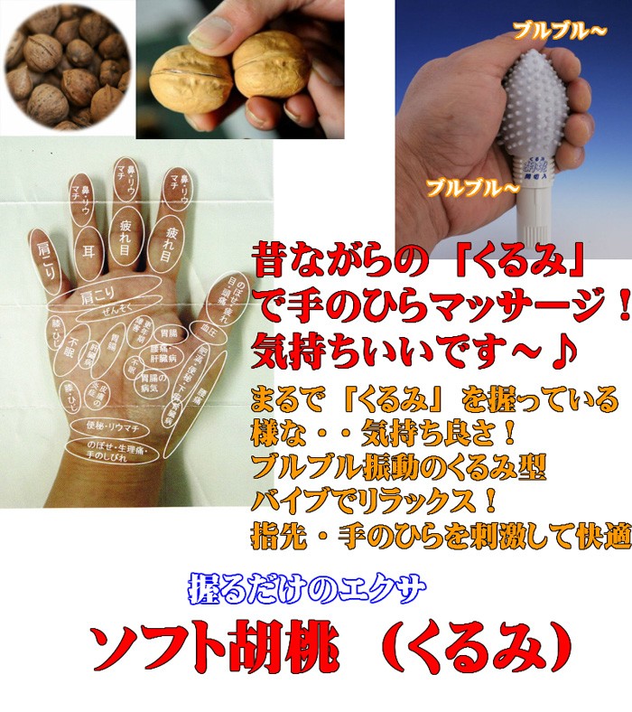 | 商品詳細 | まるで「くるみ」を握っている様な・・気持ち良さ!ブルブル振動のくるみ型バイブでリラックス!指先・手のひらを刺激して快適!首筋・肩・ふくらはぎや 足の裏!毎日10分の簡単なリラックス法です。 |