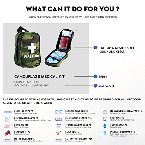 WHY CHOOSE RISEN FIRST AID KIT? RISEN is a leading supplier certificated with FDA,OSHA etc providing the high quality first aid kit,medical kit and survival products. ? FASHION CAMOUFLAGE first aid kit camping and hiking more cool and fashion than regular red color. ? NO HAND CARRY first aid kit can be attached strongly on the waist to save space and let hands free.It saves you the time when emergency happened. ? SMALL BUT MULTIPURPOSE not only as a basic medical kit also the first aid kit contains survival tools for variety emergency outdoor. ? COMPETITIVE PRICE Our first aid kit is very competitive but unique design on Amazon for long-term market. ? GOOD QUALITY Our first aid kit is made by good material durable,water resistant.And good handwork of stitching and sewing to make the first aid kit bag in good solid shape.Long and strong attach on the waist when you are in sports or outdoor activities.FDA approved medical kit combined with useful survival items too. ? MONEY BACK GUARANTEE Not completely satisfied with the quality of the first aid kit,bag,contents? Gets damaged first aid kit?Your first aid kit will be replaced or your money can be returned back! WHAT'S INSIDE THIS FIRST AID KIT? ?2x Elastic Bandage (2" x177") ?1x Nonwoven Medical tape (0.49" x 197") ?15x Band aid (0.75" x 2.83") ?4x Alcohol pre pad (2" x 2") ?5x Cotton applicator (3.15") ?5x Safty pin (1.5") ?1x Instant cold pack (0.22lb) ?1x Scissor (3.54") ?1x Metal Tweezer (3.54") ?1x Disposable Glove (Large size) ?1x Triangula Bandage (38" x 38" x 54") ?1x Tourniquet (1"x18") ?1x Emergency blanket(sliver 51" x 83") ?1x Emergency flashlight ?1x First aid bag(4.7"x2.0"x7.1") Appreciate to choose our first aid kit ! With the first aid kit whenever emergency happened you are prepared. 0 |