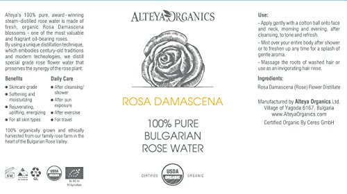 Compare to the other brands claiming to sell organic rose water and ask them if it is USDA Certified Organic and carries the USDA logo awarded only to true approved and certified brands and products, regulated by the USDA NOP program. For many years, Alteya has been growing and cherishing the beautify Rosa damascena flower. By using a unique distillation technique embodying century-old traditions and modern technology, we have distilled a special skin care grade rose water that preserves the biodinamic energy of the rose plant and increases its beautifying and rejuvenating powers.