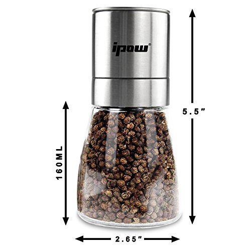 [Ergonomic design & Easy to use] The ergonomic design features a rounded brushed stainless grinder, ceramic grinder and large capacity glass body without being bulky, making it easy to twist and fill without slip ; 6 oz large capacity can reduce the frequency of refills and save your effort, By comparing the wooden grinder, the glass one will let you know when it needs refilling