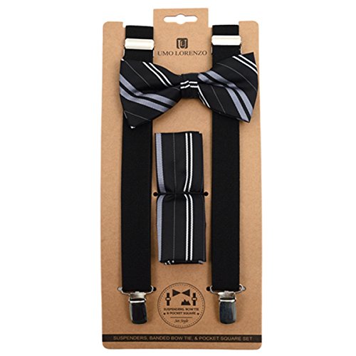 (TheDapperTie)/Accessories/Ties/DIRECT FROM USA/3pc Men's Black Banded Suspenders, Double Striped Bow Tie and Hanky Sets