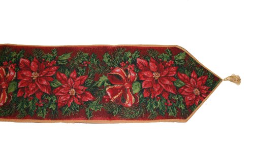 - Feature : Update your Christmas home decor with this attractive table runner . / Table decoration with attractive Christmas Poinsettia tapestry designs will add a fresh touch any room / Table runner is accented with matching tassels on each end / 48% polyester 52% Cotton, / Machine Washable, Imported .