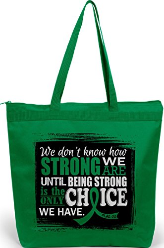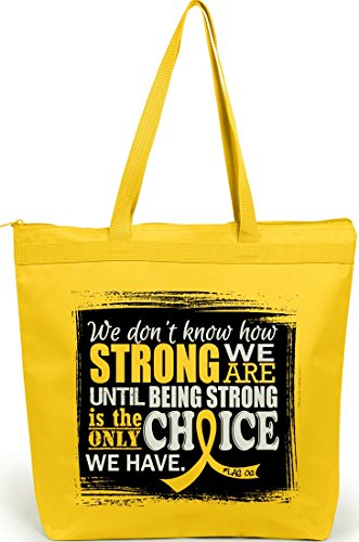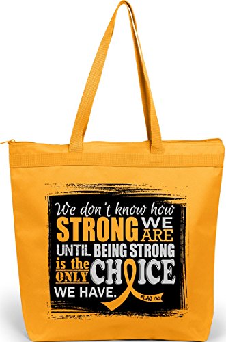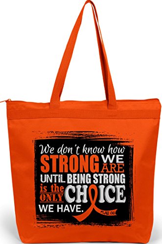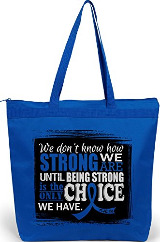 Product Description Wear your Strength over your shoulder while advocating awareness for your cause with our roomy, zippered tote bag featuring the inspiring quote "We Don't Know How Strong We Are Until Being Strong Is The Only Choice We Have" and our Signature awareness ribbon. 0
