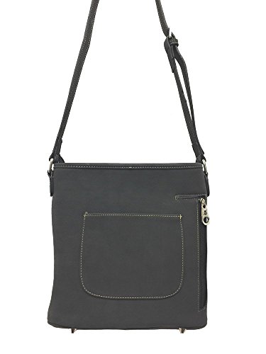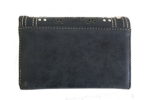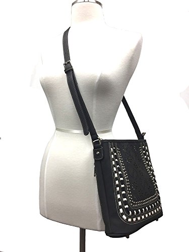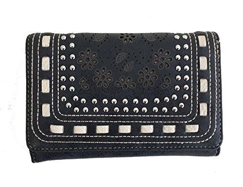 -. Feature : American Bling brand by Montana West westrn style concealed handgun cross-body messenger purse. Made with high quality PU leather. Decorated with a flower and leaves cutout design, leather stitching, and silver stud embellishments. Comes with a matching trifold wallet that features a snap closure and lots of pockets on the inside for ID, credit cards, cash, and more. / Purse features a zipper closure for the entire purse, one open pocket and a concealed gun pocket (8" x 5 ½") with zipper closure on back can accommodate a medium framed handgun, 3 inner compartments with a zipper enclosure for the middle one, two open pockets on one side, one pocket with zipper on the other side, a single adjustable strap with 21"-23" drop, and built in feet on the bottom. / Purse size: 10" tall x 10" wide x 3" deep / Wallet size: 5 ½" long x 3 ¾" tall x 1" thick