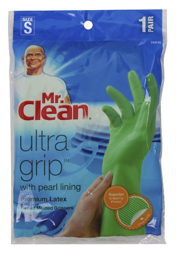 Studio : Mr. Clean Publisher : Mr. Clean Binding : Misc. Product Description Mr. Clean Ultra Grip Premium Latex Gloves features a slip resistant grip. Easy grip diamond pattern on palm gives consumers a superior grip. The smooth pearl lining helps in donning gloves and makes washing them out easy. 13" long cuff adds additional protection and can be turned up to help catch drips. Green; Size Small. 0