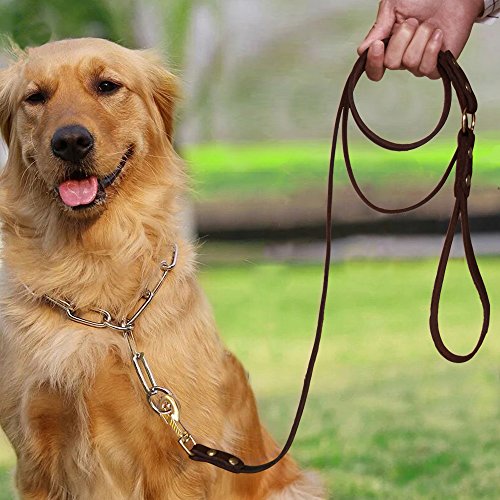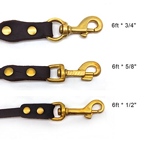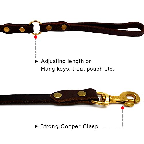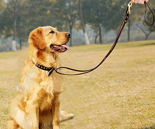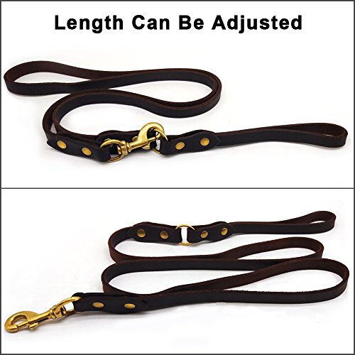 Our company specializes in pet products, and we all like pets. We are working hard for them with more suitable and comfortable pet products. We are all dog-lovers. I believe dogs for you not only your friends, partners, also your families.If you are looking for a dog leash for training, our leather dog leash is your best choice, as it is the way to go for both the dog and owner. But choose a good quality leather dog leash maybe for you is a challenge. OUR LEATHER LEASH FEATURES: ? It is 6 ft dog training leash: We follow the recommendations of dog trainers worldwide to use 6ft dog training leashes. It's soft, durable and protect your hands from dog's sudden pulls which typically cause unpleasant pain. ? It is adjustable Leather dog Leash: It can be adjusted the length to make it easier for you to control your pet dog in training or outdoor walking. If you like, two different ways to lead your dog is ok( just like picture shows) ? MILITARY GRADE TRAINING -Law enforcement and military grade of professional training. Suitable for large dogs such as German Shepherd Dog, Rottweiler, Bernese Mountain Dog. ? High quality Solid Copper Alloy Clasp: strong tensile resistance. Enough for the large dog, also suitable for medium dog and smaller puppies, clips on and off easy and sturdy. ? The leather training dog leash is sturdy, durable, dirt-resistant, elastic, soft on your hands and gentle on your dog's skin. ? It is made in China with US leather. The clasps are very strong and well made. I use these leashes everyday to walk my two Labrador Retrievers and after six months they still look great. ? NOTE: Store you leash in a dry place. Clean it with a soft damp cloth. If it gets wet, hang dry. To prolong the life of your leash we recommend the periodic application of a leather conditioner. 0