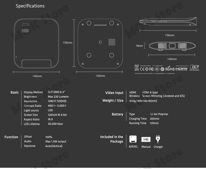 - Screen size : up to 120inch @ 4.5m