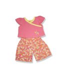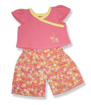 -. Feature : Peach teddy bear outfit / peach top with yellow trim / floral P.R.Int pants / fits 15 inch plush / 2 piece outfit