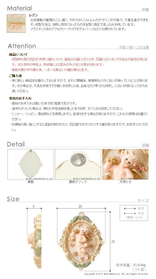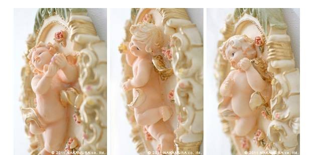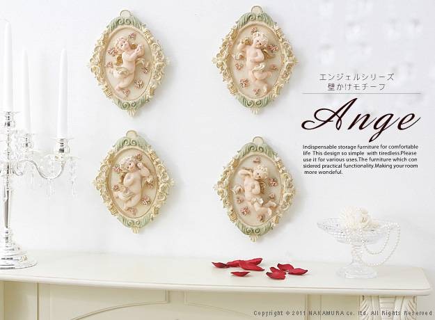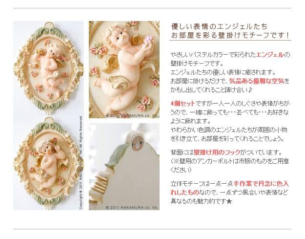 商品について:エンジェルモチーフの壁掛け。4個セットですが一人一人のしぐさや表情が違います。立体モチーフは一点一点手作業で色入れしたものなので、それぞれ趣きが異なるのも魅力的です。