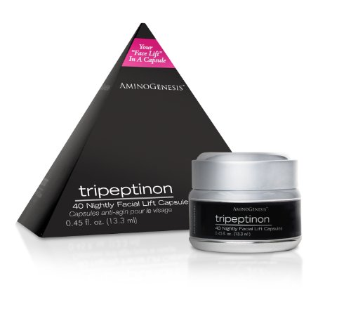 Unlock the secret of eternal youth. We may fear time, but time fears Tripeptinon. 40 nightly facial lift capsules. Tripeptinon is an amazing new technology. While other products remain on the surface, Tripeptinon penetrates deep into the skin to lift, firm and strengthen the connective tissues for the most youthful appearance possible! Sagging, loss of firmness and elasticity are all signals of breakdown in the connective tissues from the support structure for each individual skin cell. The sun, wind, harsh weather and the aging process breakdown these tissues. As a result the skin loses firmness and begins to sag. Tripeptinon travels deep into the skin taking an intracellular route (in and around the skin cells and connective tissues). Once in the skin, Tripeptinon undergoes hydrolysis which separates the fatty acids so they can be used by the skin to bolster the support structures. Next, an amazing phenomenon takes place as Tripeptinon begins to organize itself into bi-level layers to trap moisture in the skin. Lastly, complex amino peptides go to work binding with the water to ensure the highest level of hydration possible.Feature
