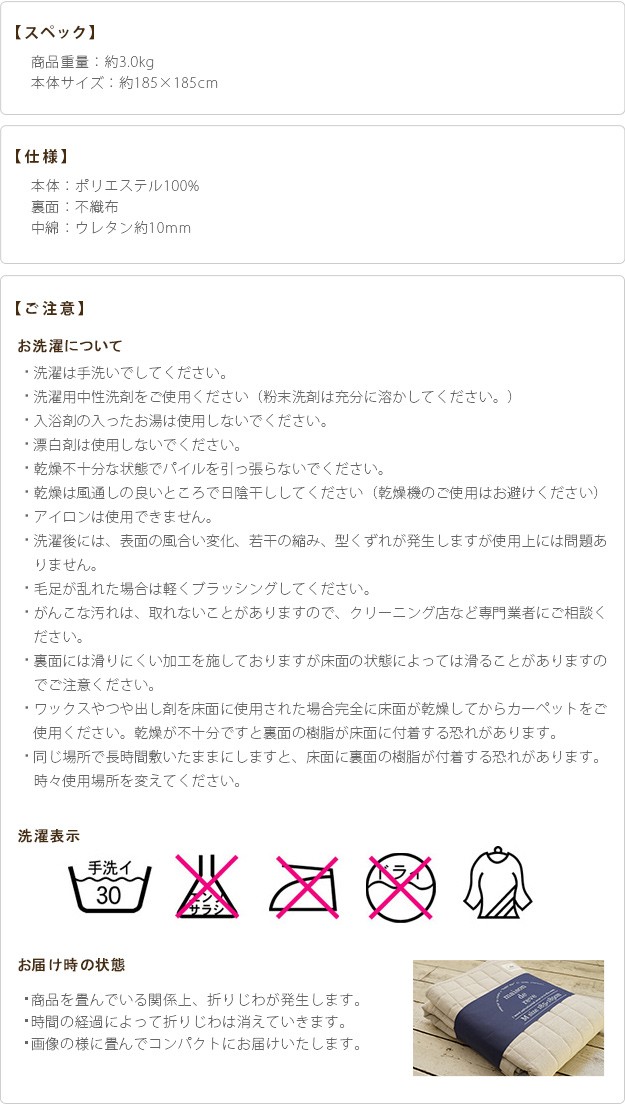 ※メーカー直送のため代金引換はお受けできません。※沖縄・一部離島は別途送料がかかります。お見積もりいたしますのでお問い合わせ下さい。【カラーバリエーション】ブラウン・アイボリー・グリーン・ブルー【仕様】本体:ポリエステル100%裏面:不織布(滑り止め加工)中材:ウレタンフォーム【サイズ】約185x185cm重量:約3kg株式会社ナカムラ(33100089)