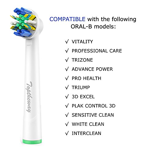-. Feature : SUPERIOR CLEAN - Our toothbrush replacement heads are FDA approved and equipped with premium USA DuPont Anti-Bacteria bristles; They are proven to reduce plaque and gingivitis up to 100% better than a manual toothbrush / MICROPULSE BRISTLES - Toptheway Floss Plus toothbrush heads has MicroPulse bristles that penetrate deep between teeth to sweep away plaque for a floss-like clean, inspired by the superior cleaning power of professional dental tools / NO COMPROMISES - We designed Toptheway brush heads to be compatible with a full line of Oral-B electric toothbrushes, including Vitality (B003UKM90Q), Pro 500 (B01AKGRP92), Pro 1000 (B01AKGRTUM), Pro 3000 (B01DT0K6J2), Pro 5000, Pro 6000 (B01KTII31K), Pro 7000 (B00F9X34XS), Pro 8000 (B01KTII3DS), and Pro-Health (B002HWS9FW), except for the Sonic models / USE WITH CONFIDENCE - Toptheway round electric toothbrush heads come highly recommend by dental professionals / SATISFACTION GUARANTEED - The quality of Toptheway toothbrush head is comparable to Oral-B Braun; If for any reason you are not satisfied, please contact us and we will replace the head or give you a refund within 90 days of your purchase with no question asked