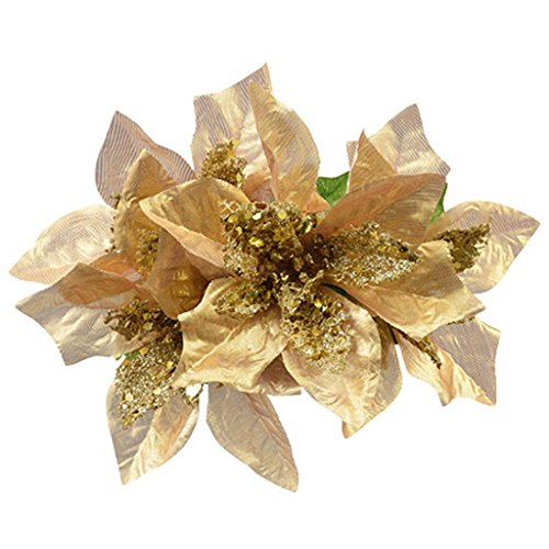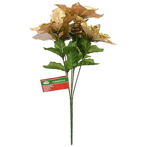6pc Christmas House Fake Flowers Holiday, 5-Stem Glittery Gold Poinsettias, 14.5 in