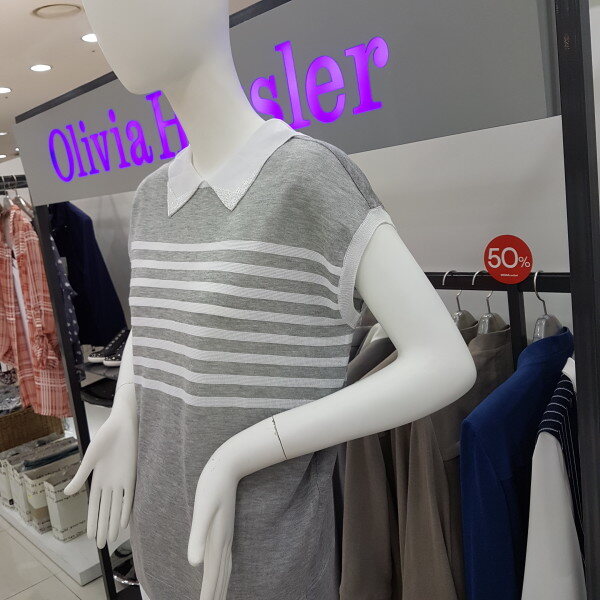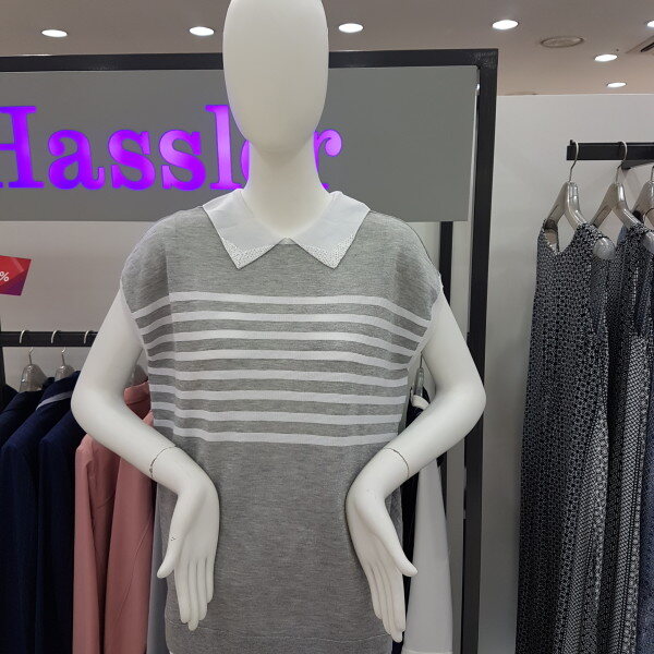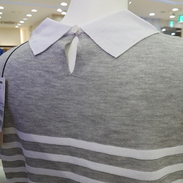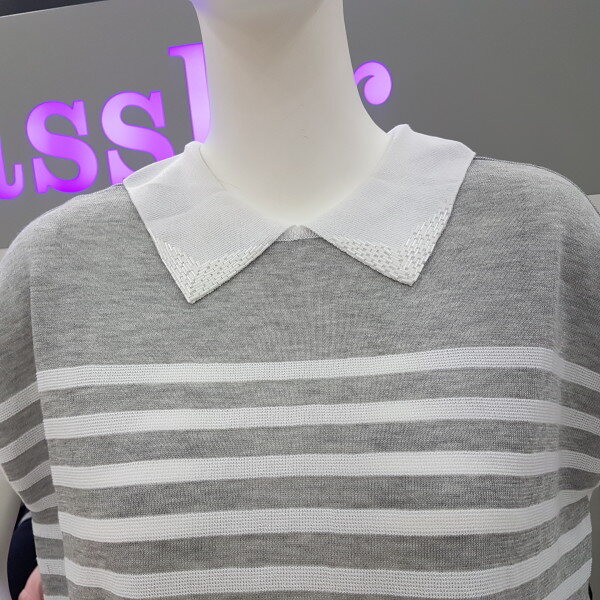 시원한 카라와 스트라이프 패턴을 넣은 간절기 니트 풀오버.