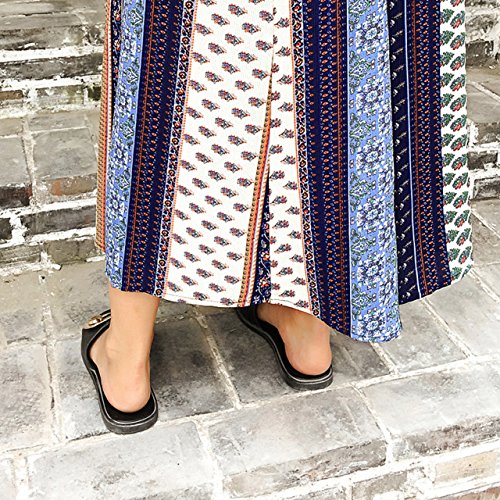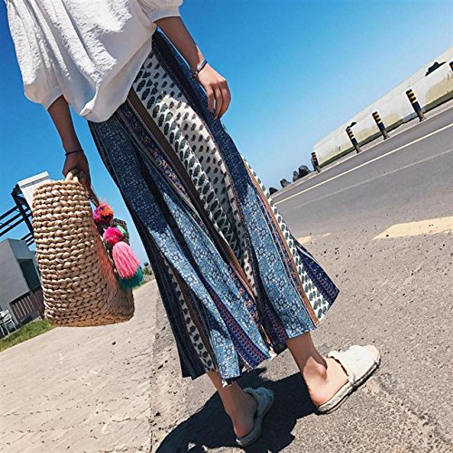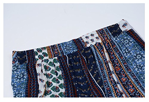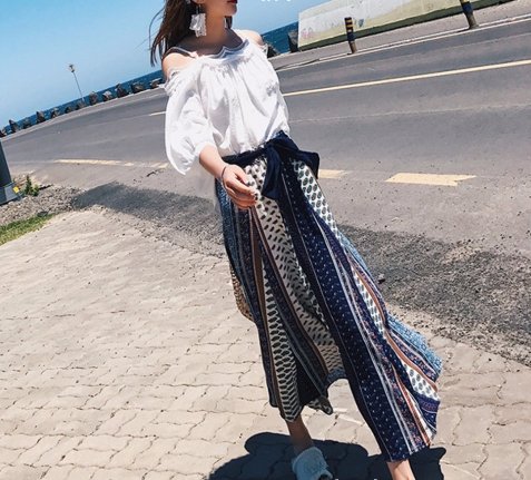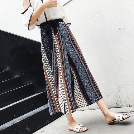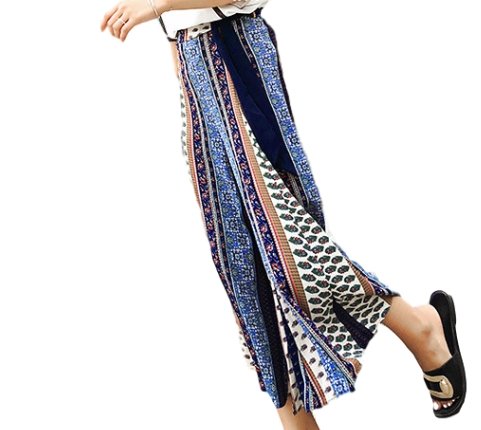 -. Feature : エスニック柄 の はきやすい おしゃれなワイドパンツ です。さらりとした 快適素材 と トレンドデザイン で おすすめのパンツ です。 オリエンタル + ストライプ 柄が旬。エアリーな幅広+前中心はわずかに長めに生地を使用。より 脚長 & 美脚 に。 / ポリエステル70%+レーヨン30%の やわらか な生地。落ち着いた ダークブルー 系で 清涼感 もあります。 / ウエスト は 幅広ゴム 。やわらかなシフォンブラック生地の リボン付 で細くキュッとしたウエストラインに。ベルトループ付きなのでウエストラインもきっちり綺麗にまとまります。 / シンプルにTシャツやノースリーブもステキ。 シック な マルチカラー なのでモノトーンやブルー、グレー、茶系や テラコッタ など アースカラー ともマッチ。デニム生地とも好相性。幅広くつかえる 優秀なボトムス です。 着心地のよい ふんわり 幅広パンツ は デイリーユース になりそうです。 / 【サイズ】S、M、L、XL   M:ウエスト約63cm、股下丈約51cm、パンツ総丈(前中心部)約84cm   L:(ウエスト約67cm、股下丈約52cm、パンツ総丈(前中心部)85cm 【サイズイメージ】通常着用サイズをおすすめいたします。身長160cm普通体型の方でM着用時、くるぶし上部の長さのイメージです。【カラー】ダークブルー系(ウエストリボンはブラック)【素材】ポリエステル70%+レーヨン30% 【付属品】ウエストリボン、後ろ中心ファスナー(約20cm)【透け感】ややあり(気になる場合はインナーの着用をおすすめいたします)