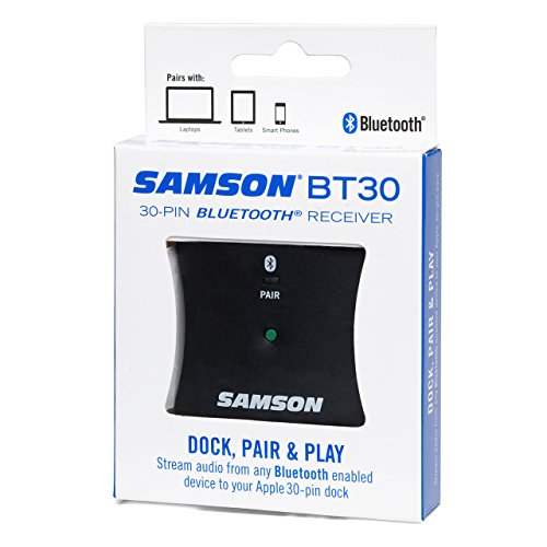 Dock, Pair PlaySamson's BT30 30-Pin Bluetooth Receiver transforms Apple 30-pin dock audio players, including select Samson Expedition Series Portable PAs, into Bluetooth-enabled receivers capable of streaming music wirelessly from smartphones, tablets and laptops. Ultra-convenient and easy-to-use, the BT30 lets you enjoy the latest in audio playback technology without sacrificing the useful accessories you've grown accustomed to for playing music, such as older iHomes, PA systems and more.Utilizing Bluetooth 3.0 technology, the BT30 receiver provides your 30-pin audio device with a 30-foot range for wirelessly streaming music. You can now control your music from afar with minimal effort, whether it's to skip to your favorite track or pause the music when the outside world comes calling. The BT30 also grants you the freedom to choose your music source. No longer bound to a certain device size or manufacturer, the ubiquity of Bluetooth protocol enables you to stream music to a 30-pin audio dock from virtually any smartphone, tablet and laptop.Easy as 1-2-3!The BT30 offers easy setup in just three simple steps: Dock, Pair and Play! Dock; Plug the BT30 receiver into your 30-pin dock audio device. Pair; Activate the Bluetooth feature on your music source and tap the Bluetooth Pair button on your BT30. Play; Select the music you wish to hear on your music source and enjoy. The receiver will even save these settings to your music source for even quicker and easier pairing the next time around. In addition, the BT30 conveniently receives its power from your audio device dock with no extra adapters or charging needed.Features:Transforms Apple 30-pin dock audio players into Bluetooth-compatible receiversPerfect for use with select Samson Expedition Series Portable PAs (XP40i, XP40iw, XP308i, XP510i)Utilizes Bluetooth 3.0 technologyProvides 30-foot range for wirelessly streaming musicEasy setup via Bluetooth Pair buttonSaves settings to your music source for easy