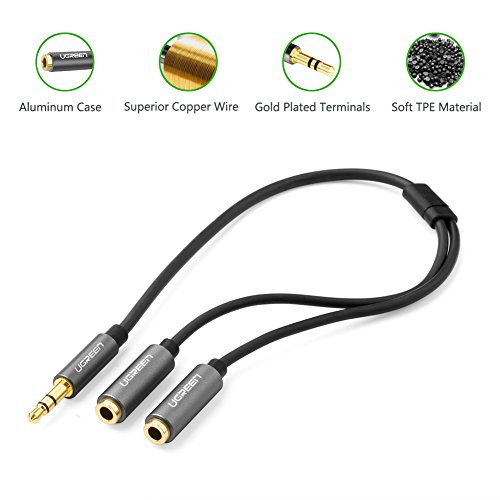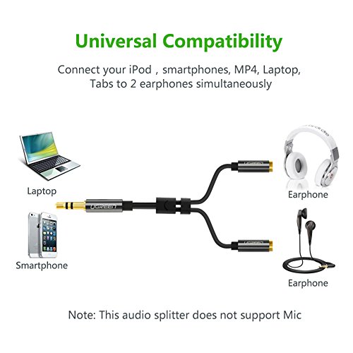 Description Ugreen 3.5mm Audio stereo splitter cable converts a single 3.5mm stereo jack to two 3.5mm stereo jacks. It allows you to share music with your family or friends through headphones from the same source. It supports mobile phone, MP3 player, tablet, notebook, PC etc. The metal case connector allows you to plug it to your source device wihtout taking off your mobile/Tab case.