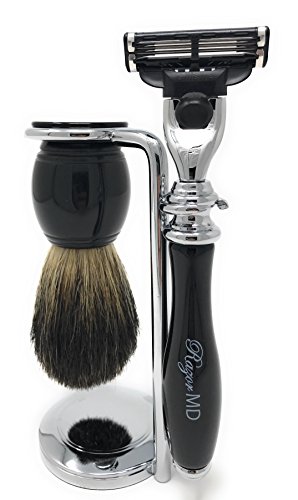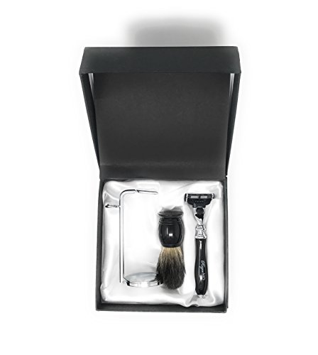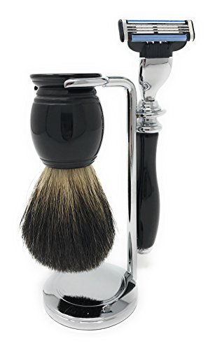 ESSENTIAL TOOLS – Included in our flagship set; one (1) Black 360 (3 blade razor) w/ razor blade cartridge, one (1) Badger Hair Shave Brush and a chrome brush/razor stand.