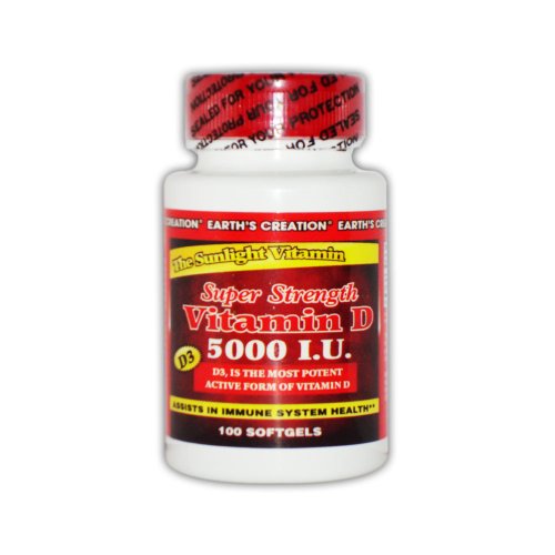 -. Binding : Health and Beauty -. Brand : Earth's Creation USA -. EAN : 0608786001084 -. Feature : D3 is the most potent active form of vitamin D / Vitamin D assists in maintaining a healthy immune system.* / Extra Strenght / THE SUNLIGHT VITAMIN! / Assists in Immune System Health* -. IsAdultProduct : 0 -. Label : Earth's Creation USA -. Manufacturer : Earth's Creation USA -. PackageQuantity : 1 -. ProductGroup : Health and Beauty -. ProductTypeName : HEALTH_PERSONAL_CARE -. Publisher : Earth's Creation USA -. Studio : Earth's Creation USA -. Title : Earth's Creation Super Strength Vitamin D 5000 IU - 100 Softgels -. UPC : 608786001084