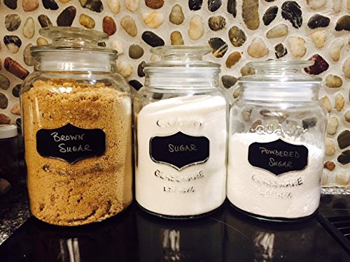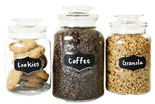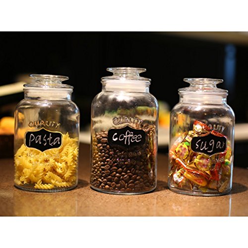 - 3 Jars, Endless Options: Use our decorative glass canisters to store sugar, flour, spices, seeds, shells, beads, bath salts, powders & more. You get 3 versatile sizes: 34, 43 & 54-oz (1, 1.2 & 1.5L)