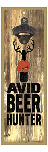 (SJT07451) Avid beer hunter - beer bottle with antlers wearing hunting vest holding a gun - wood background 5" x 15" Bottle Opener Plaque Sign