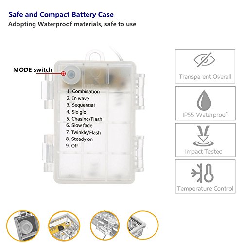 - ✜Remote Controller with 8 Light Modes: The battery operated light have 8 lighting mode with combination, wave, sequential, slo glo, chasing, solve fade, twinkle and steady on, which can controlled by wireless remote or the switch on the battery compartment.