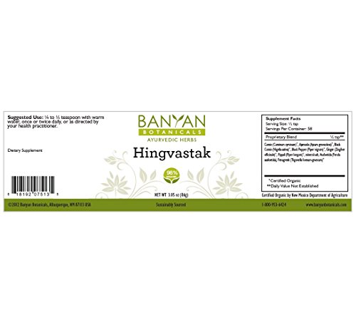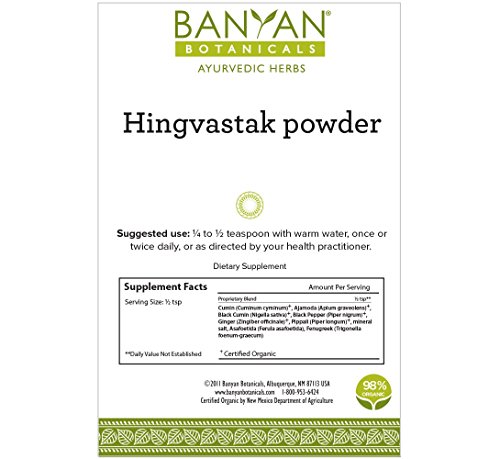 -. Binding : Health and Beauty -. Brand : Banyan Botanicals -. Feature : Promotes healthy digestion* / Calms excess vata in the GI tract promoting intestinal calm and comfort* / Supports proper assimilation and absorption* / Helps maintain regularity* -. IsAdultProduct : 0 -. Label : Banyan Botanicals -. LegalDisclaimer : * These statements have not been evaluated by the Food and Drug Administration. This product is not intended to diagnose, treat, cure, or prevent any disease. -. Manufacturer : Banyan Botanicals -. MPN : A7510 -. PartNumber : A7510 -. ProductGroup : Health and Beauty -. ProductTypeName : HEALTH_PERSONAL_CARE -. Publisher : Banyan Botanicals -. Studio : Banyan Botanicals -. Title : Banyan Botanicals Hingvastak Powder - 98% Certified Organic, Vata Digest - Digestion formula for vata*