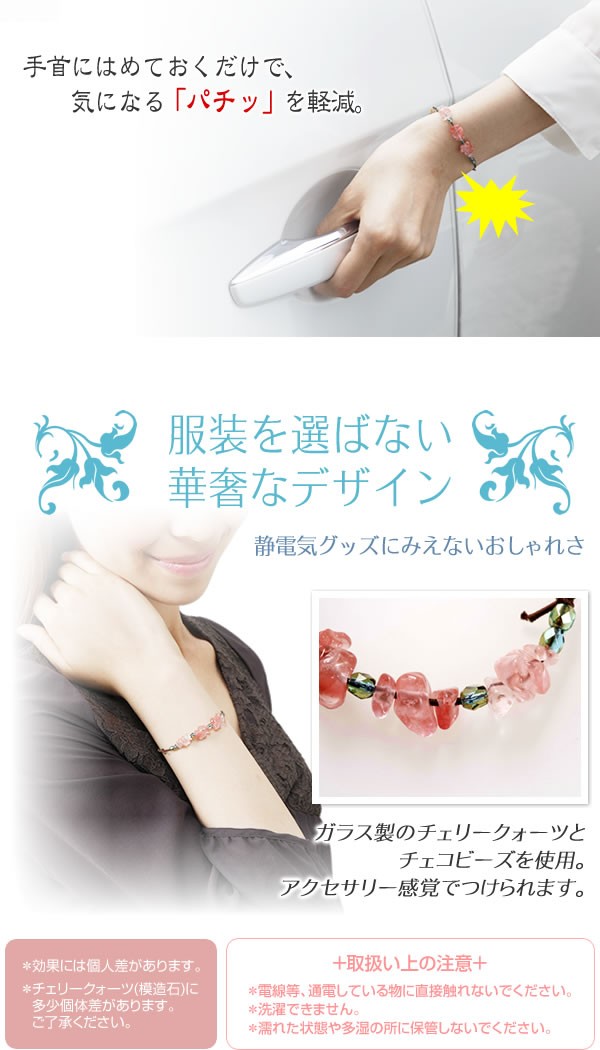 | 静電気対策グッズには見えない華奢なデザイン。さりげなく着けられてどんな服装にもなじみやすく、お出かけ時にもぴったり!ガラス製のチェコビーズとチェリークォーツが可愛らしいブレスレット。 |