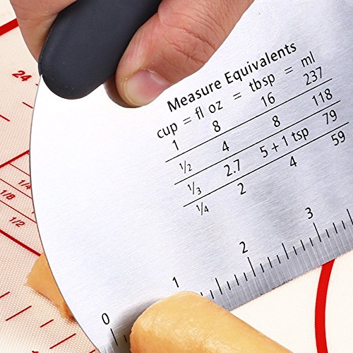 The quick reference measurements on the side helped me make equal portions. Highly recommended. Also useful in scraping the flour and gooey bread crumbs off my marble during clean-up.Handle is very comfortable.