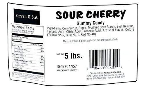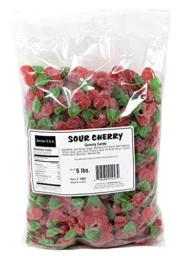 -. Feature : Sour Cherry Gummy Candy, 5 Lbs / The delicious sour cherry taste you love in gummy candy form! These Gummi Sour Twin Cherries are not only cute to look at and decorate candy crafts with, but they're just as delicious to eat. / Each of these novelty candy treats has a sour bite to their cherry flavor. / Perfect for birthdays, special events, candy buffets / Made in Turkey - HALAL CERTIFIED CANDY.