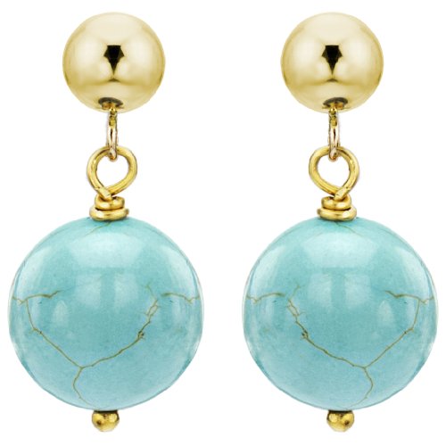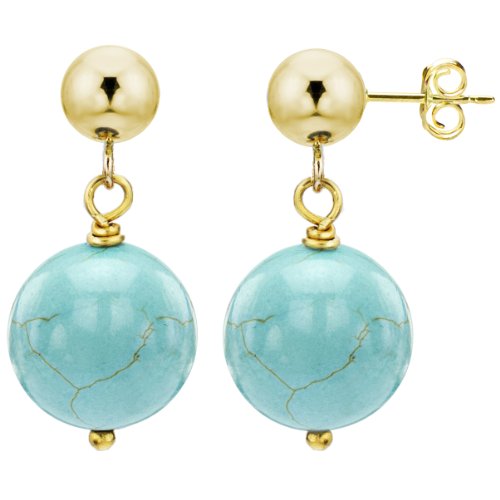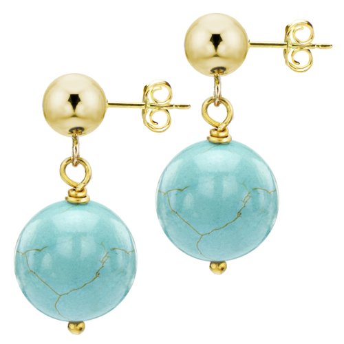 14k Yellow Gold with 8mm Simulated Blue Turquoise Stud Dangle Earrings