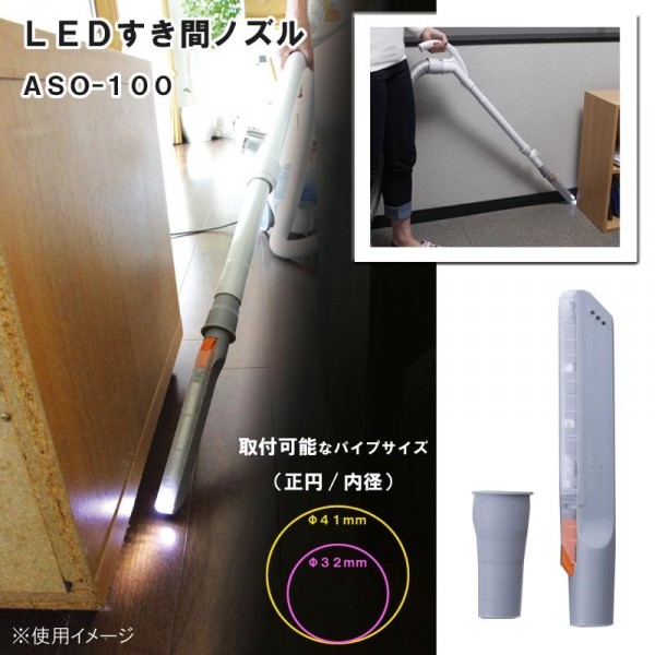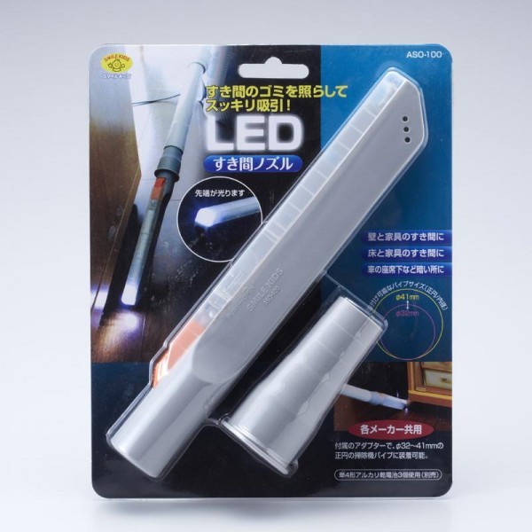 | 掃除機のすき間の先端にLEDがついて、暗い隙間などを明るく照らしてゴミを吸引できるノズルです。車の座席下など暗いところを照らして掃除ができます。市販の大半の掃除機のノズルに装着できるよう、アダプターも付属。ハンディーTYPEやスタンドTYPEにも装着可能です。 |