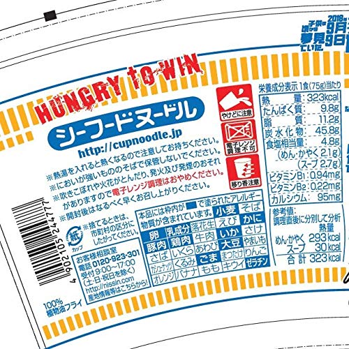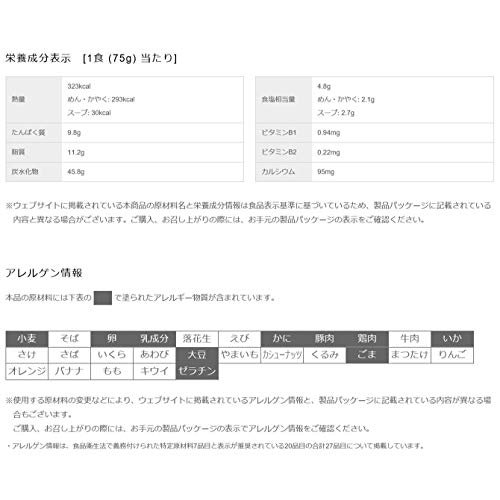 原材料:油揚げめん(小麦粉、植物油脂、食塩、たん白加水分解物、しょうゆ、香辛料)、スープ(チキンエキス、ポークエキス、糖類、香辛料、粉末しょうゆ、乳等を主要原料とする食品、ポーク調味料、野菜調味料、たん白加水分解物、魚介エキス、野菜調味油、食塩、魚醤、ポーク調味油)、かやく(いか、キャベツ、魚肉練り製品、味付卵、ねぎ)/加工でん粉、調味料(アミノ酸等)、香料、炭酸Ca、香辛料抽出物、かんすい、増粘多糖類、カロチノイド色素、ベニコウジ色素、酸味料、カラメル色素、酸化防止剤(ビタミンE)、乳化剤、炭酸Mg、ビタミンB2、ビタミンB1、(一部にかに・小麦・卵・乳成分・いか・ごま・大豆・鶏肉・豚肉・ゼラチンを含む)