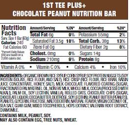 Studio : SCNS Sports Foods Publisher : SCNS Sports Foods Binding : Health and Beauty Product Description 1st Tee Plus Chocolate Peanut Bars 1st Tee Plus Chocolate Peanut Nutrition Bars help you to keep calm and play on, whether your game is on the links, the court, the gym - or anywhere! A divine layer of chocolate is topped with hearty oats, soy and crisp rice. Chamomile, hops, and valerian root support calmness and focus. A balanced combination of complex carbohydrates, protein, vitamins and minerals provide nutrition. 0