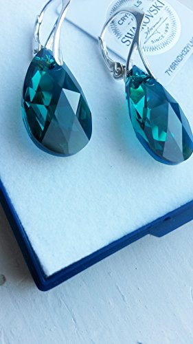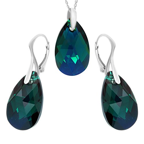 Treat the one you love to these dark green earrings and necklace. Simple yet stylish, these pieces of jewelry feature sparkling crystals from Swarovski. The lever-back findings and the chain are made of Sterling Silver 925.