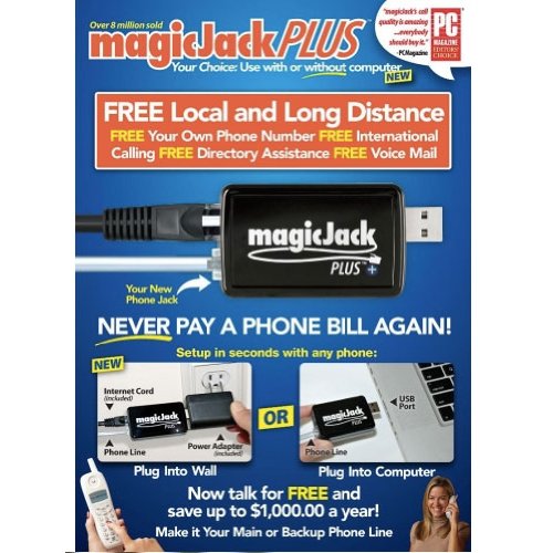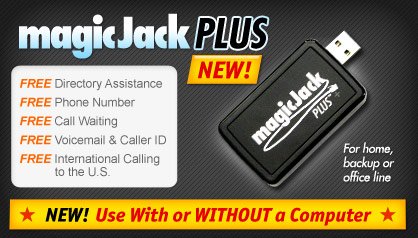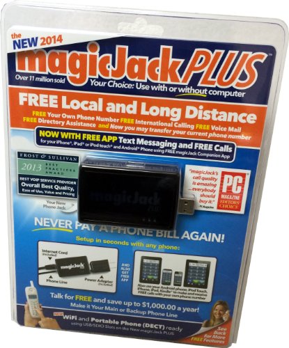Calling All Savings Seekers Get the New 2014 magicJack PLUS, make the switch today and say goodbye to your monthly phone bills. FREE 6 Months magicJack Phone Service With magicJack PLUS. Features of the New magicJack PLUS - No Monthly Bills - Free Caller ID - Free Voicemail - Free Call Forwarding - Free Call Waiting - Free 411 - Free International Calling To The U.S. & Canada From Anywhere** Crystal Clear Voice Quality Stop dropping mobile phone calls indoors. Experience consistent local and long distance voice quality. Take your Phone Anywhere Travel with your magicJack PLUS device and make Unlimited local & long distance calls to the U.S. and Canada. ** Free International Calling To The U.S. & Canada From Anywhere - the New 2014 magicJackTM PLUS is portable and can be utilized to make FREE calls to any phone in the United States, Canada, USVI and Puerto Rico from anywhere in the world. Connect Anyway You Want There are more ways to call with magicJack PLUS - get Unlimited local & long distance calling to the U.S. and Canada using your home phone, computer or mobile phone. Keep Your Current Number Port your existing phone number and avoid the hassle of notifying all of your contacts. Plus, individuals outside the United States or Canada can receive calls on their New 2014 magicJackTM PLUS phone number from the United States or Canada for FREE or the prevailing local rate. (This is a particularly attractive feature for businesses, international students here, students studying abroad military personnel, their families, and international travelers.) Included with your magicJack PLUS: - New 2014 magicJack PLUS Device - Ethernet Cord - Power Adapter - USB Extension Cord + 6 months of Free ServiceFeature
